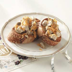Amestecă untul cu usturoiul și întinde-l pe feliile de baghetă, apoi pune-le în cuptorul preîncălzit la 150 grade timp de 2-3 minute. Adaugă apoi aproximativ un sfert de ceașcă de amestec de ciuperci cu pui pe fiecare felie de baghetă, adaugă cașcavalul ras și lasă-le în cuptor pentru încă 1-2 minute, până când cașcavalul s-a topit.