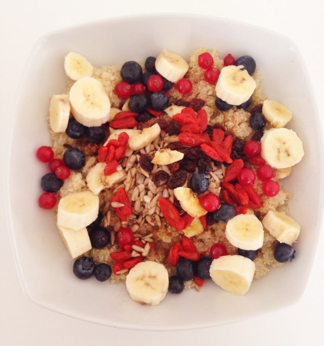 Ingrediente: quinoa fiartă seminţele de floarea soarelui pe care le-am lăsat cu o seară înainte la hidratat afine coacăze banane goji hidratate seminţe de chia sirop de agave după gust scorţişoară."Preparatul final a ieşit foarte bun! Puteţi să puneţi orice seminţe sau fructe deshidratate pe care le aveţi în casă şi care vă fac cu ochiul. Ca-n modă şi-n bucătărie e important să fiţi curajoase să experimentaţi. Nu ştiţi niciodată ce iese", scrie vedeta pe blogul său personal.
