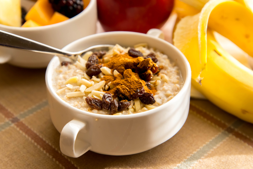 Mic dejun - Terci de ovăz făcut în apă şi amestecat cu puţin lapte, felii de banană, stafide şi scorţişoară.