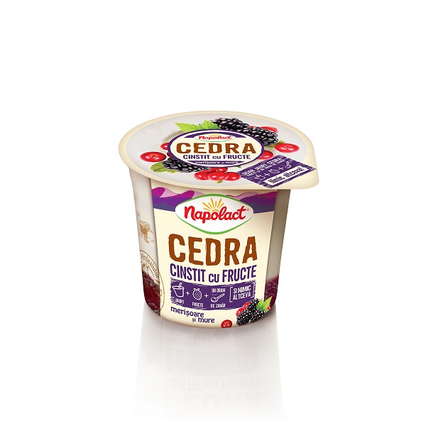 Napolact lanseazăo gamă unică de iaurturi cu fructe, Cedra Cinstit cu Fructe, cu o rețetă simplă cu doar 3 componente: iaurtul unic Cedra, bucăți de fructe și un dram de zahăr. Nimic altceva!