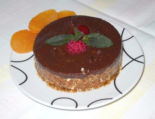 Pentru a prepara crema de ciocolată se mixează caju cu sucul de portocale în blender. Dacă este nevoie, se adaugă şi puţină apă pentru a permite nucilor să devină o pastă cremoasă. Ambele tablete de ciocolată se topesc la abur, după care se încorporează în pasta de caju. Se adaugă miere de albine şi coaja de portocală, amestecându-se bine crema. Se toarnă într-o forma pentru tort cu pereţii detaşabili şi se lasă la frigider o oră sau până s-a întărit bine.