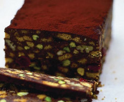 1. Se rup în bucăţi mici biscuiţii şi se amestecă împreună cu nucile, fisticul şi cireşele confiate.