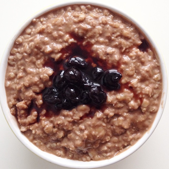 o cană cu lapte vegetal (soia, orez, ovăz, cocos, migdale)4-5 linguri cu fulgi de ovăz1 linguriţă cu cacao1 bananăgem/dulceaţă/nuci/seminţe/fructe.