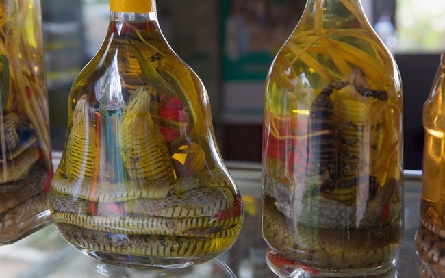 În China şi Vietnam poţi să comanzi un vin de şarpe, care se consumă în cantităţi mici, deoarece adesea se folosesc şi şerpii veninoşi. Această băutură populară în aceste ţări ar avea proprietăţi revigorante pentru organism. Se prepară prin introducerea şarpelui în vinul preparat din orez sau prin mixarea sângelui de şarpe cu alcool. Foto: http://www.telegraph.co.uk