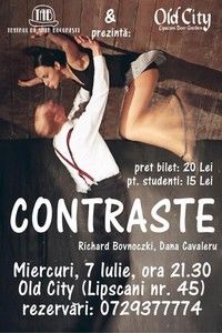 La ora 20:30 esti asteptata la spectacolul de teatru Contraste cu si de Richard Bovnoczki si Dana Cavaleru. "Contraste" este primul lor proiect independent. Momentul in care au inceput sa spuna propriile lor povesti. Cele doua personaje se trezesc dimineata in acelasi pat si incearca sa-si aminteasca de unde se cunosc. Povestea lor fie ca e spusa cu gesturi, cuvinte, sunete sau pasi de step e un antidot impotriva rutinei. Rasul deschide o portita dincolo de care orice se poate intampla.