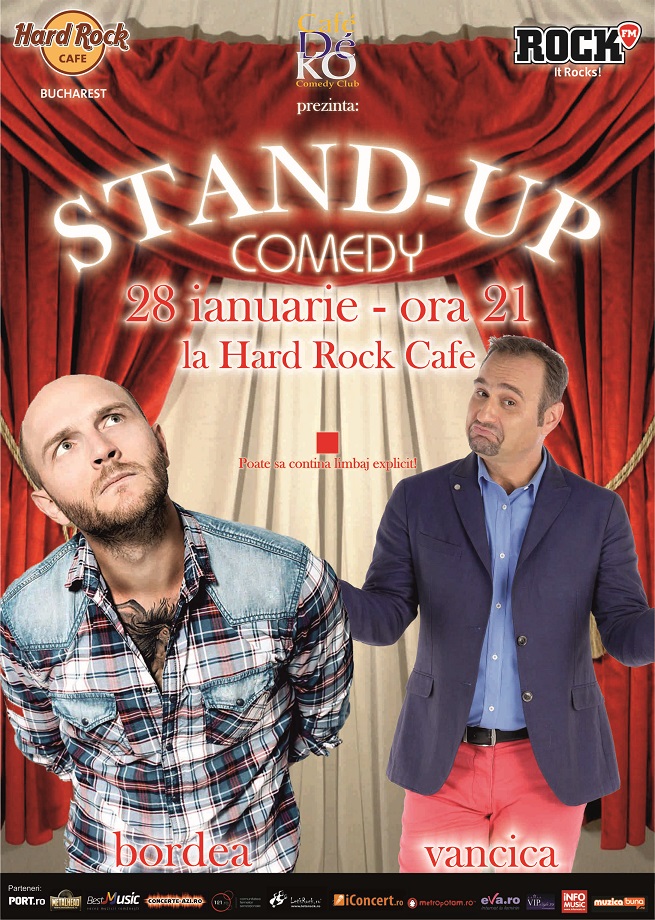 Serile de stand up comedy continuă la Hard Rock Cafe cu vedete de primă mână: BORDEA şi VĂNCICĂ, două staruri ce fac senzaţie pe platourile TV, vin în premieră la Hard Rock Cafe pe 28 ianuarie, pentru o repriză de umor molipsitor.