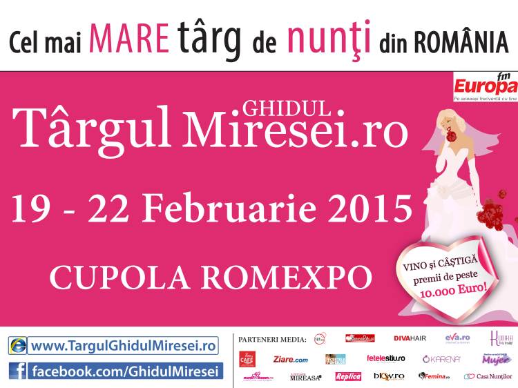Cei 10 ani de Ghidul Miresei vor fi sărbătoriţi începând cu data de 19 februarie 2015, orele 14,00 când are loc deschiderea oficială a Târgului Ghidul Miresei. Locul întâlnirii noastre cu expozanții și vizitatorii rămâne Cupola Romexpo unde timp de patru zile cei mai competitivi furnizori de servicii de nuntă se vor întâlni cu viitorii mirii pentru a-i consilia în alegerile lor. La ediția aniversară sunt așteptați peste 300 de expozanţi şi zeci de mii de vizitatori, într-un spaţiu impresionant de peste 15.000 mp.