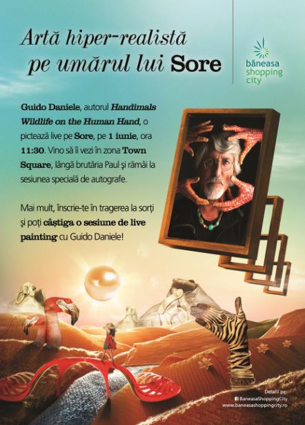 Pe 1 iunie începând cu ora 11:00, iubitorii de artă de toate vârstele vor putea lua parte la o experiență de neratat: celebrul artist Guido Daniele va picta unul dintre animalele naționale ale României pe corpul frumoasei Sore! Evenimentul are loc la inaugurarea colecției de fotografii „Handimals – Wildlife on the Human Hand”, adusă pentru prima oară în țara noastră, în exclusivitate în Băneasa Shopping City. Colecția cuprinde 24 de fotografii ale unor picturi hiper realiste înfățișând animale, ce folosesc mâinile oamenilor drept pânză. Aceasta va fi amplasată în zona Town Square (lângă brutăria Paul) şi va fi deschisă publicului larg între 30 mai și 9 iunie.