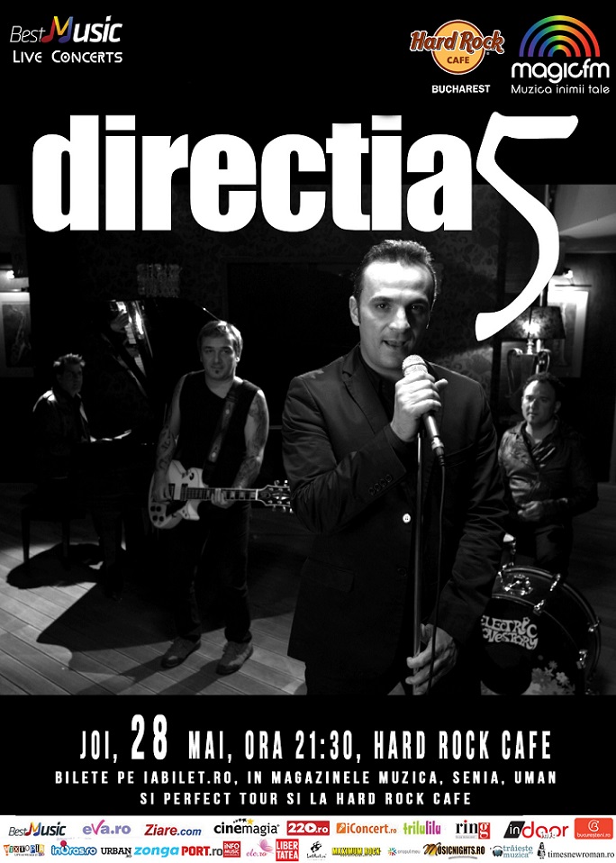 Continuam joi pe 28 mai, cu inca un concert incendiar cu directia 5 de la ora 21:30 unde trupa va prezenta showul “Forever Love” la Hard Rock Café. Cu peste 20 de ani in lumina reflectoarelor, directia 5 este fara indoiala una dintre cele mai iubite trupe de pop-rock romanesti cu peste 25 de materiale discografice (LP,EP) si mii de concerte la activ.