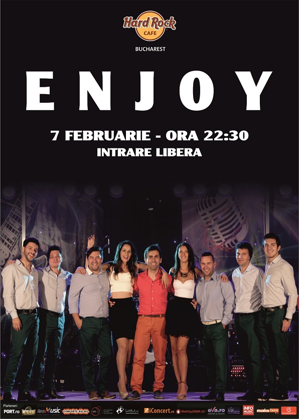 Muzica bună trebuie savurată, sunt de părere componenţii trupei ENJOY şi sunt gata să-ţi arate cum să trăieşti clipa din plin, sâmbătă, 7 februarie, la Hard Rock Cafe! Vino să te bucuri în paşi de dans de fiecare acord, la un concert în care hiturile din repertoriul internaţional vor fi la ordinea zilei! Intrarea este liberă, iar concertul începe la 22.30. ENJOY convinge prin pasiune, energie, fineţea interpretării şi simţul detaliului: playlistul pentru fiecare show al trupei fiind elaborat pentru a răspunde perfect dorinţelor publicului! Aşa că pe 7 februarie te aşteptăm la Hard Rock Cafe, pentru o seară pe gustul tău, plină de piese celebre, lansate de Ricky Martin, Ray Charles, Gloria Estefan, Shakira, Rhianna şi mulţi alţii!