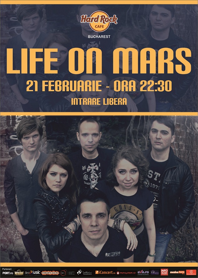 Pe 21 februarie, LIFE ON MARS aduce muzica din altă galaxie, pe scena de la Hard Rock Cafe! Daca iti place rockul cu influenţe brit pop şi hiturile lansate de Rhianna, Amy Winehouse, Black Eyed Peas, Blur, Duffy, Deja Vu si James Brown, sunt pe gustul tău, nu pierde întâlnirea cu LIFE ON MARS! Intrarea va fi liberă.