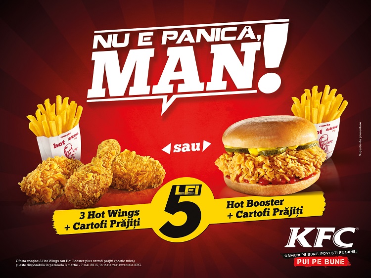 Pentru al doilea an consecutiv, KFC include în meniu combinații delicioase ale produselor-vedetă, la prețul unic de 5 lei. Fanii brandului pot alege una dintre ofertele„hot”: Hot Booster, Crispy Sandwich sau 3 Hot Wings + o porție mică de cartofisau pot opta pentru varianta nepicantă: Booster + o porție mică de cartofi.