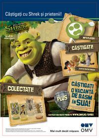 Pe durata campaniei, clientii care achizitioneaza produse si servicii din statiile OMV si PETROMV primesc taloane razuibile si pot castiga premii instant, inspirate de protagonistii noului film Shrek: unul dintre cele patru modele de capete de creion cu Shrek, Magarusul, Motanul Incaltat si Gingy sau un MP3 player Shrek.