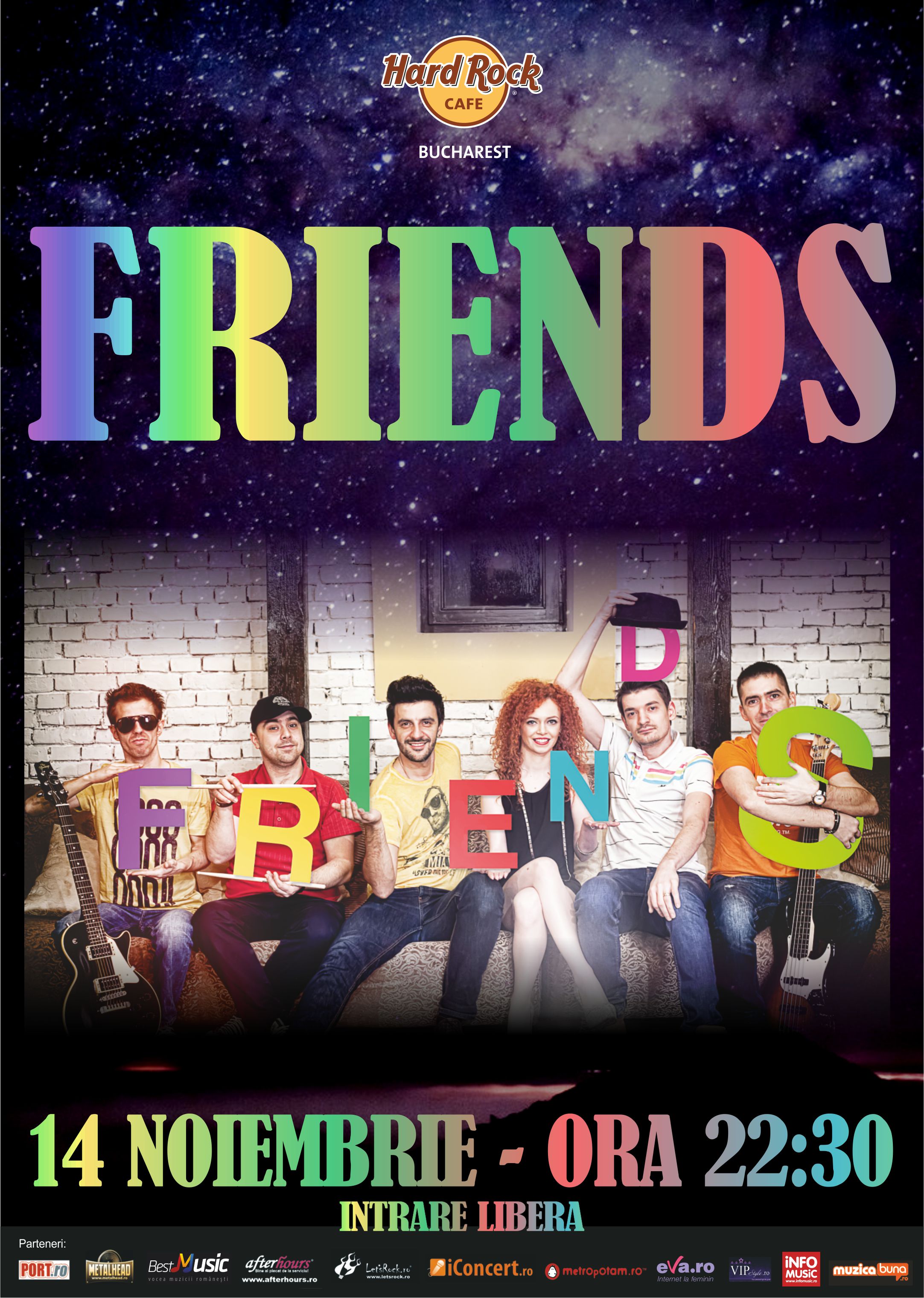 Şase muzicieni cu experienţă, voie bună cât cuprinde, ritmuri diverse şi melodii cunoscute. Acestea sunt ingredientele minune din reţeta pentru o seară de sâmbătă perfectă, la Hard Rock Cafe! Pe 14 noiembrie vino alături de grupul FRIENDS să te bucuri de muzică si de o seară cu prietenii tăi!