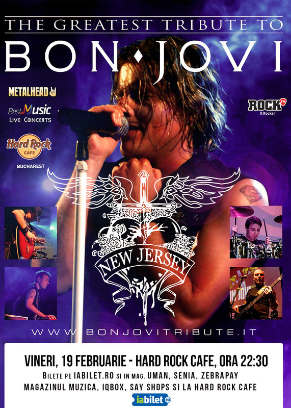 BestMusic Live Concerts te invită la Hard Rock Cafe pentru o seară incendiară alături de trupa italiană “New Jersey”. Vino pe 19 februarie să cânţi “Bed Of Roses”, “Living On A Prayer”, “Keep The Faith”, “Blaze Of Glory”, “Runaway”, “It’s My Life”, “Always” şi multe alte refrene cu care Bon Jovi a cucerit topurile mondiale!
