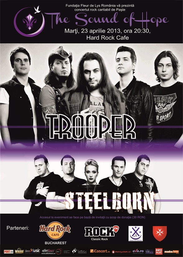 Fundația “Fleur de Lys” organizează evenimentul “The sound of hope”, la Hard Rock Cafe Bucuresti, în cadrul campaniei cu scop umanitar “Ospitalitatea – Onoarea de a reda speranța”. Pe 23 aprilie, de la ora 20:30, Trooper, cea mai iubita formatie de heavy metal din Romania si Steelborn, vor susţine un concert caritabil, care ne va readuce sunetul sperantei si bucuria de a ii ajuta pe ceilalti. Moderatorul acestui eveniment va fi Luana Ibacka.