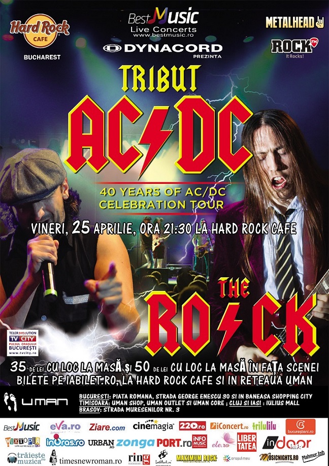 Pe 25 aprilie te invitam sa sarbatoresti 40 de ani de AC/DC alaturi de “THE R.O.C.K.”, una dintre cele mai prolifice trupe tribut ale formatiei australiene. Hiturile celebre ale celor de la AC/DC, insotite de solo-uri lungi de chitara, se vor auzi intr-un spectacol unic.