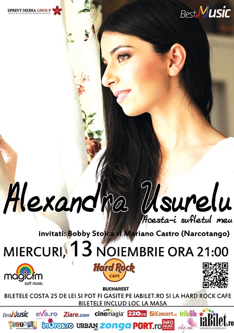 Alexandra Usurelu, Mariano Castro (Narcotango) si Bobby Stoica vor canta la Hard Rock Cafe miercuri, 13 noiembrie, de la ora 21:00, in cadrul unui concert organizat si prezentat de BestMusic si Sprint Media."Acesta-i sufletul meu" este o prestatie artistica ce promite sa ramana in sufletele iubitorilor de muzica, vorbind despre dragoste, despre oameni, despre sufletul fiecaruia.