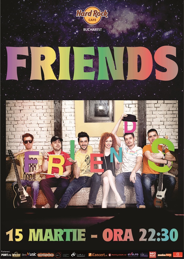 Sambata acesta, lasa-te inconjurat de prieteni! Suna-i pe toti si ia-i cu tine pe 15 martie, de la ora 22:30, la primul concert al trupei Friends in Hard Rock Cafe! Vino sa asculti live hituri ca: Walk of Life (Dire Straits), Valerie (Amy Winehouse), Billie Jean (Michael Jackson), Funhouse (Pink) sau Kalasnikov (Goran Bregovic) si, nu uita, prietenul…la concert se cunoaste!