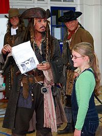 Depp i-a surprins pe toţi copiii făcându-şi apariţia costumat ca Jack Sparrow, alături de alţi câţiva piraţi de pe platoul de filmare.