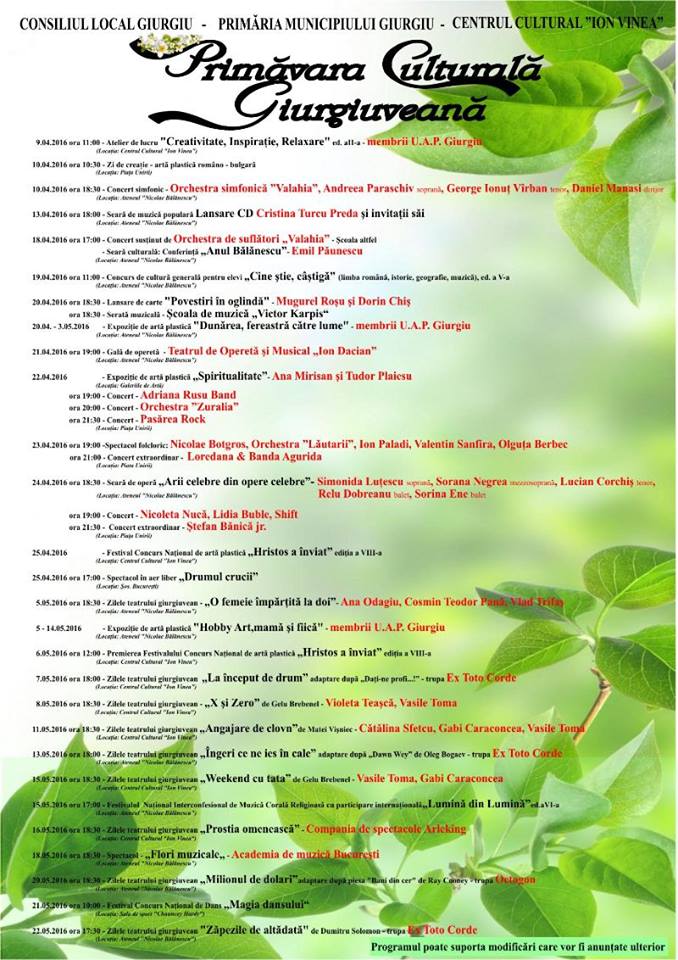 25.04.2016 - Festival Concurs Național de artă plastică „Hristos a înviat", ediția a VIII-a (Locația: Central Cultural "Ion Vinea”) 25.04.2016, ora 17:00 - Spectacol în aer liber „Drumul crucii" 05.05.2016, ora 18:30 - Zilele teatrului giurgiuvean - „O femeie împărțită la doi"- Ana Odagiu, Cosmin Teodor Pană, Vlad Trifaș (Locația: Ateneul "Nicolae Bălănescu") 05- 14.05.2016 - Expoziție de artă plastică "Hobby Art,mamă și fiică - membrii U.A.P. Giurgiu (Locația: Ateneul "Nicolae Balanescu") 06.05.2016, ora 12:00 - Premierea Festivalului Concurs Național de artă plastică „Hristos a Înviat", ediția a VIII-a (Locația: Centrul Cultural "Ion Vinea") 07.05.2016, ora 18:00 - Zilele teatrului giurgiuvean „La început de drum", adaptare după „Dați-ne profi...!" - trupa Ex Toto Corde (Locația: Centrul Cultural "Ion Vinea") 08.05.2016, ora 18:30 - Zilele teatrului giurgiuvean - „X și Zero" de Gelu Brebenel - Violeta Teașcă, Vasile Toma (Locatia: Central Cultural "Ion Vinea") 11.05.2016, ora 18:30 - Zilele teatrului giurgiuvean „Angajare de clovn", de Matei Vișniec - Cătălina Sfetcu, Gabi Caraconcea, Vasile Toma (Locația: Centrul Cultural "Ion Vinea") 13.05.2016, ora 18:00 - Zilele teatrului giurgiuvean „Îngeri ce ne ies în cale", adaptare după „Dawn Wey" de Oleg Bogaev - trupa Ex Toto Corde (Locația: Ateneul "Nicolae Bălănescu") 15.05.2016, ora 18:30 - Zilele teatrului giurgiuvean „Weekend cu tata" de Gelu Brebenel - Vasile Toma, Gabi Caraconcea (Locația: Centrul Cultural „Ion Vinea”)15.05.2016 ora 17:00 - Festivalul Național Interconfesional de Muzică Corală Religioasă cu participare internațională „Lumină din Lumină " - ed.aVI-a (Locația: Ateneul "Nicolae Bălănescu") 16.05.2016 ora 18.30 - Zilele teatrului giurgiuvean „Prostia omenească" - Compania spectacole Arleking (Locația: Centrul Cultural "Ion Vinea”)18.05.2016 ora 18:30 - Spectacol - „Flori muzicale„ - Academia de muzică București (Locația: Ateneul "Nicolae Bălănescu") 20.05.2016 ora 18:30 - Zilele teatrului giurgiuvean „Milionul de dolari”, adaptare după piesa "Bani din cer" de Ray Cooney - trupa Octogon (Locația: Ateneul "Nicolae Bălănescu)21.05.2016 ora 10:00 - Festival Concurs Național de Dans „Magia dansului" (Locația: Sala de sport "Chauncey Hardy") 22.05.2016 ora 17:30 - Zilele teatrului giurgiuvean "Zăpezile de altadată" de Dumitru Solomon - trupa Ex Toto Corde (Locația: Ateneul "Nicolae Bălănescu")