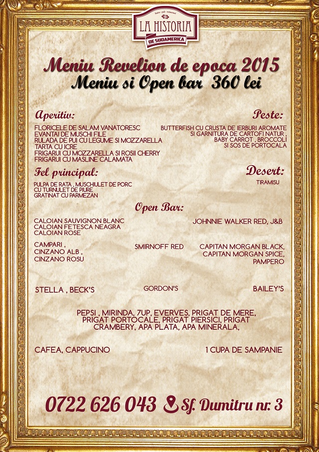 Restaurantul La Historia ofera in seara de Revelion Open Bar. Nu vor lipsi vinurile Caloian Savignon Blanc, Caloian Feteasca Neagra, Caloian Rose, dar nici Campari, Cinzano, vodka Smirnoff, whiskey Johnnie Walker Red, J&B, berea Stella Artois si Beck’s, precum si sucuri naturale.
