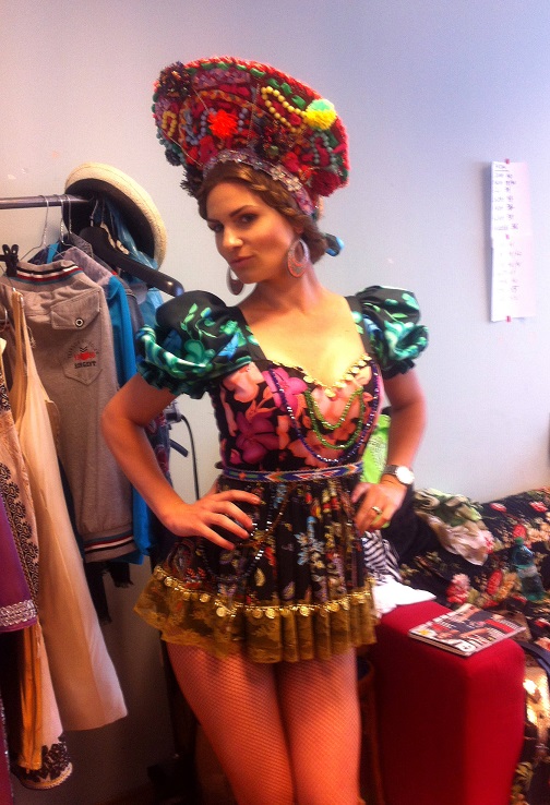 Artista va îmbrăca o rochiță foarte scurtă, cu imprimeu floral și bănuți aurii atașați, dres tip plasă, cizme înalte, iar pe cap va purta o coroană kokosnik împodobită cu mărgele multicolore.