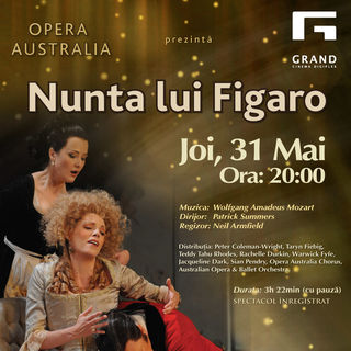 “Nunta lui Figaro”, celebra operă a lui Mozart în 4 acte, este o poveste plină de intrigi şi întorsături de situaţie. Totul începe atunci când stăpânul lui Figaro, contele Almaviva, este plictisit de relaţia conjugală şi încearcă să o cucerească pe Susanna, logodnica lui Figaro. Reprezentaţia este oferită de Opera Australia, avându-l ca dirijor pe Patrick Summers.