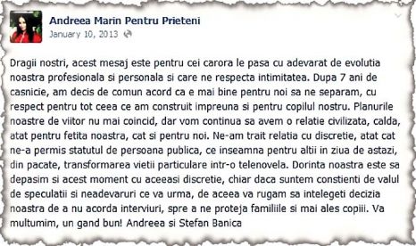 "Dragii mei, dragele mele, vă mulţumesc cu toată inima pentru minunatele mesaje, apeluri, sms-uri cu gânduri calde şi iertare vouă că nu v-am răspuns, dar sper să înţelegeţi de ce am ales să stau departe de telefon sau de internet şi să trăiesc aceste zile aşa cum simt: în linişte, iubire şi pace sufletească. Aveam nevoie să fiu cu mintea şi cu inima doar lângă cele două suflete atât de importante pentru mine, în intimitate. Pentru familia noastră, aceasta a fost cea mai bună alegere"