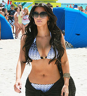 Kim este un mare fan al plajelor din Miami. Iat-o aici într-un costum de baie marca Vitamin A by Amahlia Stevens accesorizat cu bijuterii din colecţia Virgin, Saints & Angels, care aparţine surorii sale