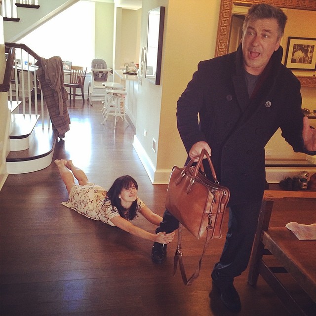 În cealaltă poză, starul e surprins în timp ce încearcă să plece la serviciu, dar Hilaria încearcă să-l oprească, plonjând la podea și ținându-se cu mâinile de piciorul lui drept. O fotografie foarte reușită, care transmite multă veselie și sentimentul că în familia Baldwin domnește buna dispoziție.
