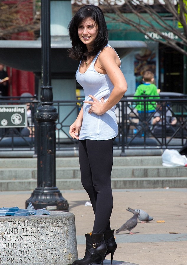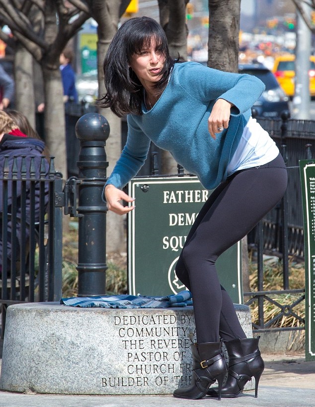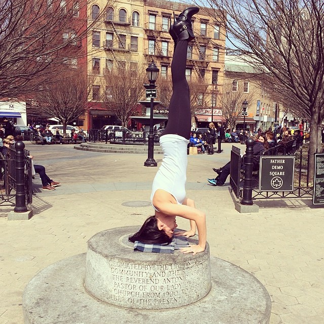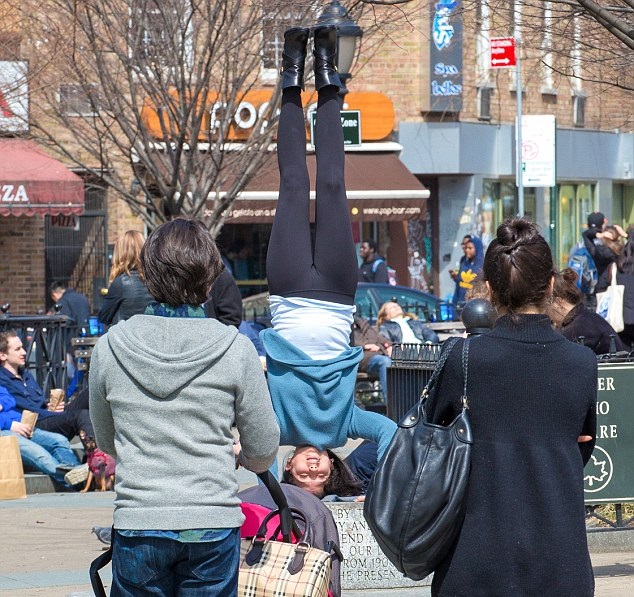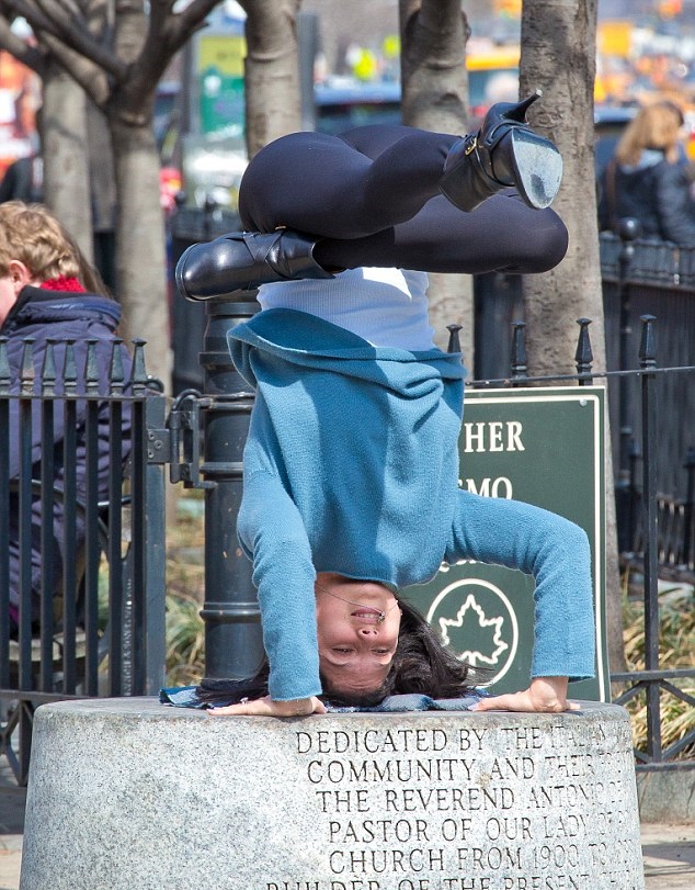 Sâmbătă, ea a fost fotografiată în Piața Father Demo, din New York, unde stătea pe un soclu, cu capul în jos și cu un picior îndoit sub celălalt.