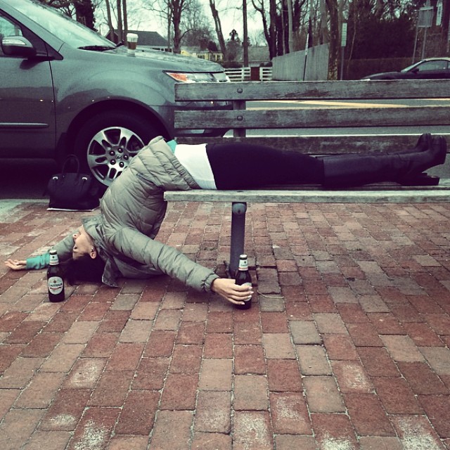 Săptămâna trecută, de Ziua Sfântului Patrick, ea s-a întins pe o bancă de pe stradă, cu capul atârnând pe caldarâm și cu o sticlă de bere alături, mimând o persoană care a băut prea mult.