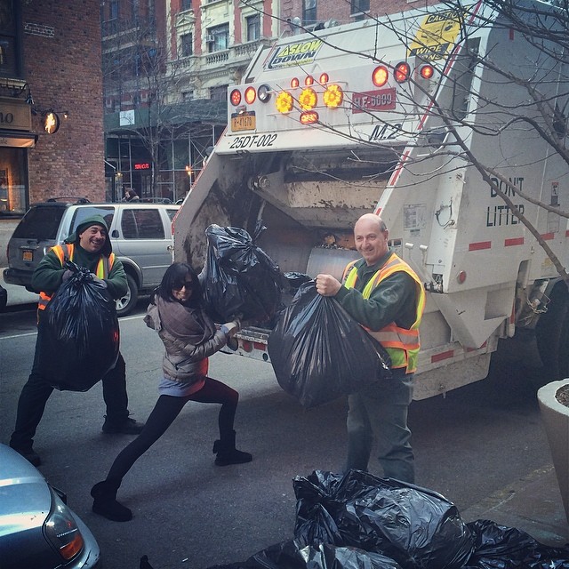 Ea a mai pozat cu doi muncitori de la serviciul de salubritate care adunau sacii cu gunoi menajer, dar și cu o trupă de stripperi costumați sumar, în echipament de pompieri.