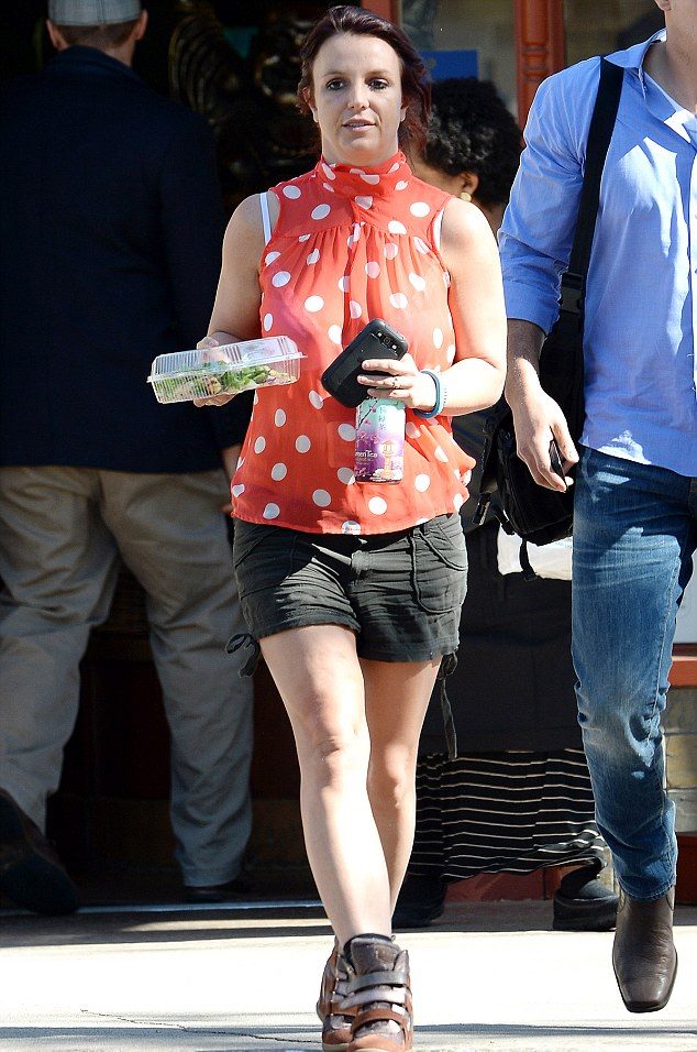 Îmbrăcată în pantaloni scurți și o cămașă roșie fără mâneci cu buline albe, Britney a ieșit dintr-un magazin din care și-a cumpărat o salată și arăta ca o femeie obișnuită, nicidecum ca o vedetă foarte aranjată.