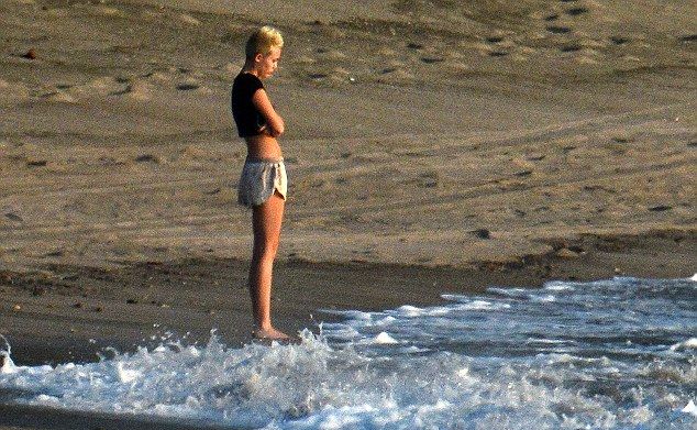 Cu părul vopsit blond şi tuns scurt, Miley era îmbrăcată cu o pereche de păantaloni scurţi şi un tricou negru care nu-i ajungea la buric.