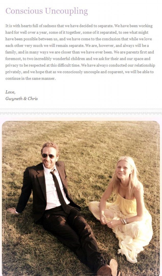 Potrivit revistei People, actrița și solistul trupei Coldplay se despărțiseră de mai mult timp. Publicația chiar a mers mai departe și a scris în ediția din 14 aprilie că starurile aveau o "relație deschisă", iar pe Gwyneth n-o afecta dacă artistul o înșela cu o altă femeie.