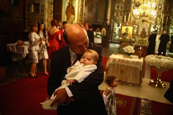 Traian Băsescu îl ține în brațe pe cel de-al treilea nepot, mama e în planul doi