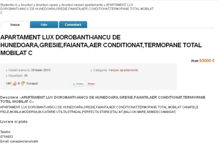 Acestea sunt coordonatele puse la dispoziţia eventualilor clienţi de vânzătoare, nimeni alta decât diva de cinci stele. Pe unele dintre paginile de internet, de specialitate alese pentru promovare, apar şi poze din interiorul locuinţei, dar şi opţiunea de închiriere. Dacă nu găseşte un client care să vrea să cumpere locuinţa, Zăvoranu acceptă şi să închirieze în schimbul unei sume cuprinsă între 500 şi 600 de euro pe lună. Se ştie însă că Oana nu este un proprietar tocmai plăcut, ultima chiriaşă plecând cu mare scandal din apartament, după spusele vecinilor, citaţi de Libertatea.