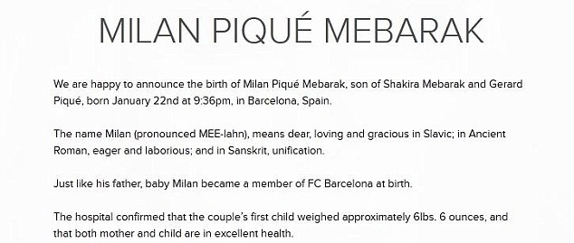"Suntem fericiţi să anunţăm naşterea lui Milan Pique Mebarak, fiul Shakirei Mebarak şi al lui Gerard Piqué, născut la 22 ianuarie, la ora 21.36 (20.36 GMT) la Barcelona, în Spania"