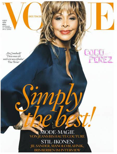 Mai bine mai târziu decât niciodată. La fel gândeşte şi Tina Turner care, la 73 de ani, a decis să pozeze pentru prima dată în renumita revistă Vogue. Celebra cântăreaţă a apărut pe coperta numărului din luna aprilie a ediţiei germane. Pentru descrierea fotografiei de pe copertă a fost folosit textul "Simply The Best", titlul unui cântec celebru lansat de vedetă în 1989.