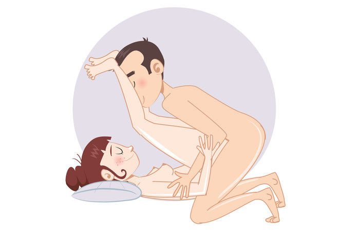Tu stai întinsă, iar iubitul tău va sta în genunchi între picioarele tale. Aşează-ţi picioarele pe umerii lui, în timp ce el te ridică puţin.