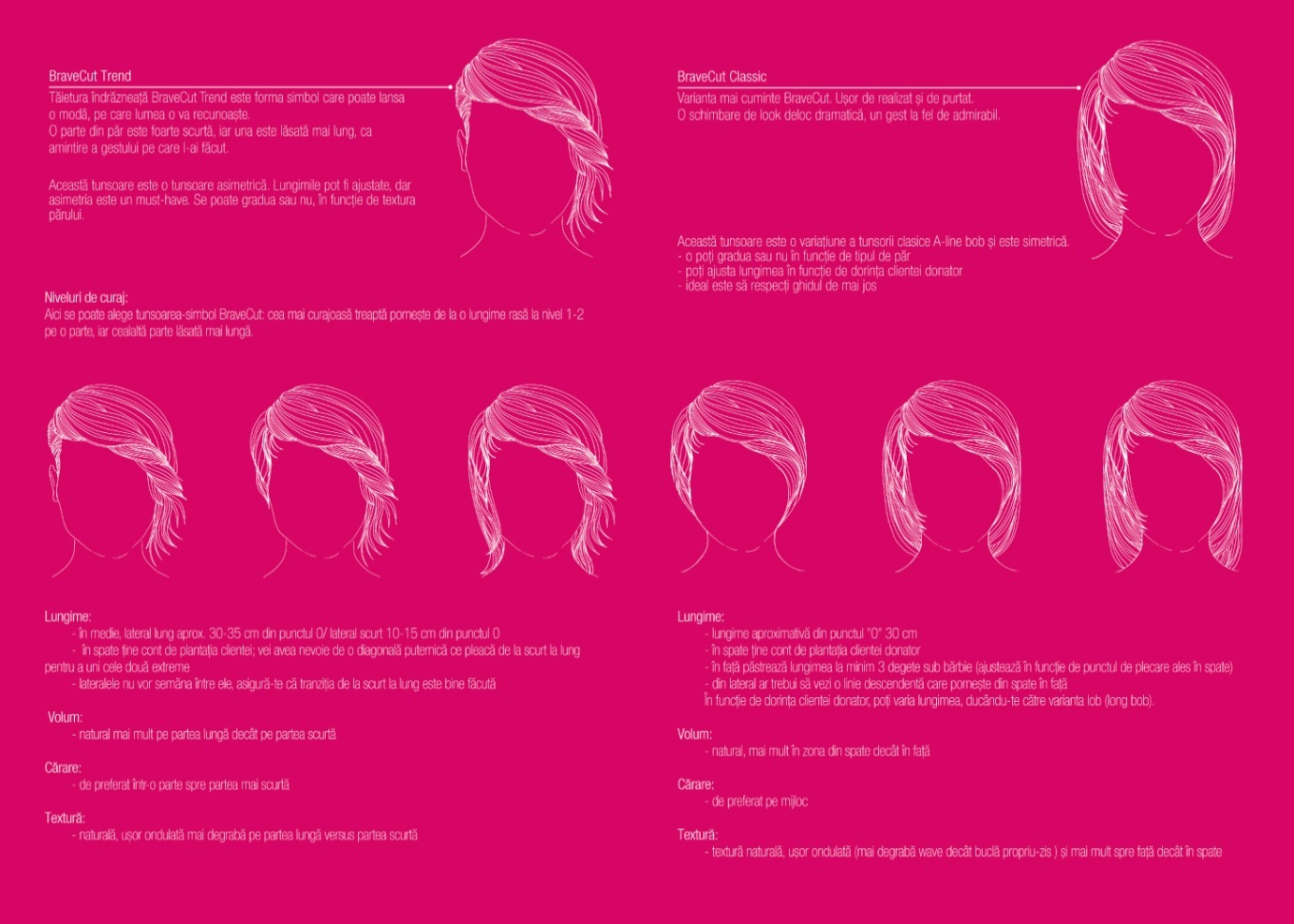 Lungimea minimă a părului donat este de 15 cm - cu cât mai mult, cu atât mai bine! Părul se strânge într-o coadă cu mai multe elastice de păr. Iar după tăiere, se pune în punga specială de colectare BraveCut. Toate codițele sunt colectate de Fundația Renașterea și folosite pentru realizarea de peruci.