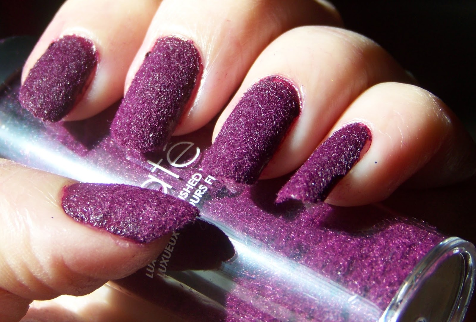 Numită şi manichiură velvet, acest stil imită perfect efectul de catifea pe unghii. Este de fapt o ojă peste care se aplică un strat fin de pudră textilă asemănătoare catifelei. Vei avea nevoie de pudră textilă pe care o poţi cumpăra din magazinele de produse cosmetice. Iată cum să realizezi manichiura catifea:- aplică un strat de lac protector