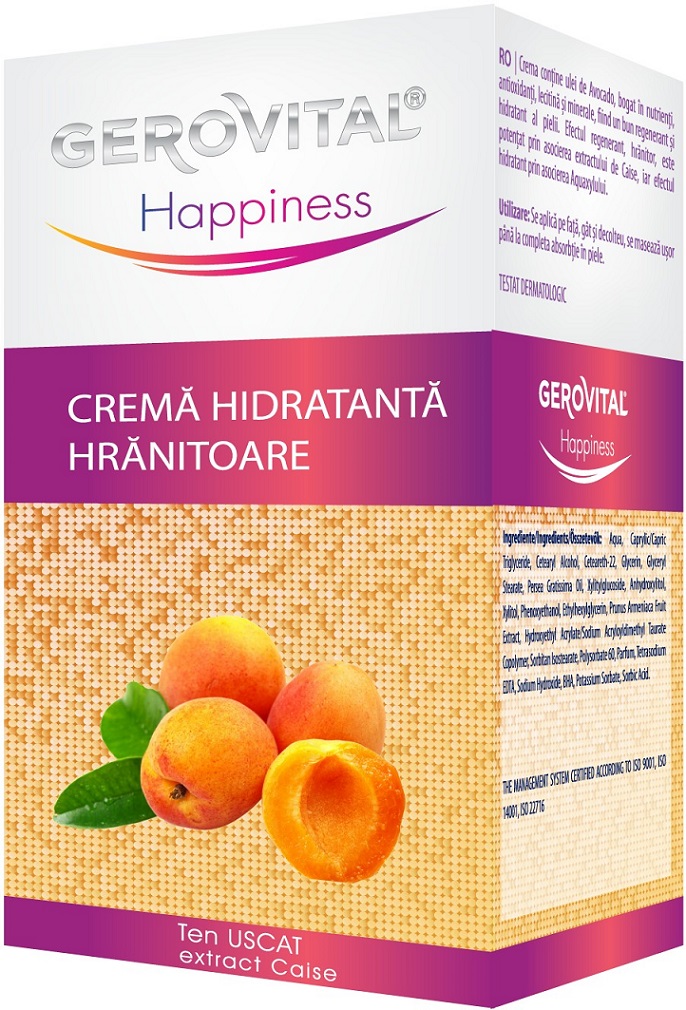 Gerovital Happiness cu extract de caise este indicată pentru îngrijirea pielii uscate. Acțiunea hidratantă și remineralizantă a extractului de caise este potențată de uleiurile vegetale precum cel de avocado sau de măsline, care lasă pielea catifelată și plină de strălucire. Produsele îmbogățite cu acest extract din gama Gerovital Happiness sunt: Fluidul de curățare zilnică, ideal pentru demachierea tenului uscat, Crema hidratantă hrănitoare, bogată în nutrienți și antioxidanți, Masca gomaj, cu granule din sâmburi de caisă, Crema CC–mediu și Crema deodorantă hidratantă picioare.