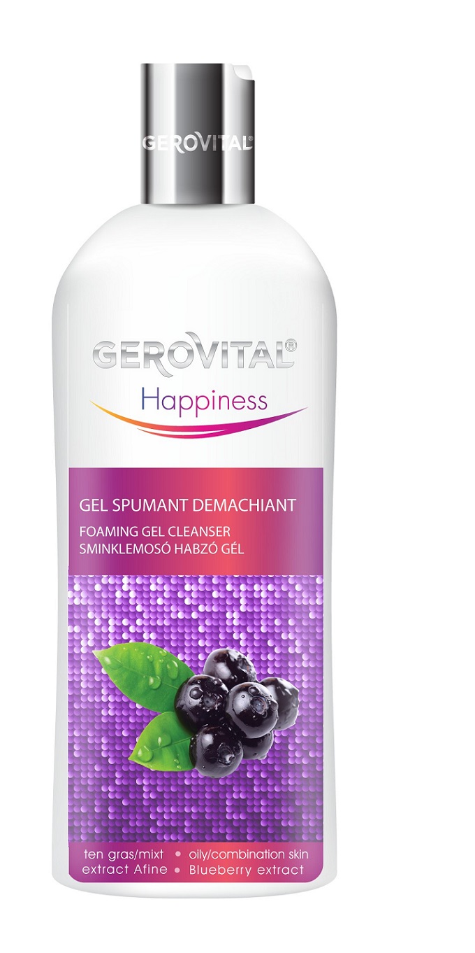 Gerovital Happiness cu extract de zmeură este potrivită pentru îngrijirea tenului normal datorită flavonoizilor, zaharurilor și vitaminei C conținute de zmeură. Alături de acestea, produsele conțin vitamina E, Aquaxyl, Lipomoist și ulei de măsline, toate având rolul de a hidrata în profunzime pielea și de a combate procesele de îmbătrânire cutanată. Din subgama Gerovital Happiness cu extract de zmeură fac parte Crema gel curățare față, care demachiază cu delicatețe tenul, Masca hidratantă răcoritoare cu un efect protector antioxidativ, Crema hidratantă răcoritoare, ce reface rezervele hidrice ale dermului, Crema CC – deschis, Loțiunea hidratantă corp și Scrubul pentru picioare.
