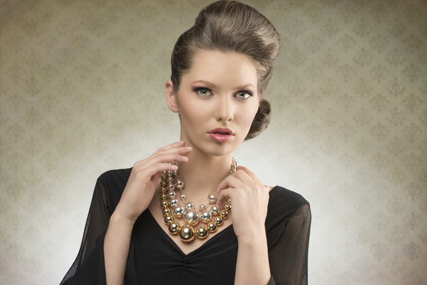 Nimic nu se potriveşte mai bine cu un decolteu Queen Anne decât un colier vintage. Poţi opta pentru o replică statement a colierelor cu perle şi rubine pe care le purta însăşi Regina.
