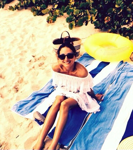 Şi vedetele internaţionale s-au îndrăgostit de trendul off shoulders. Olivia Palermo a ales pentru plajă o rochie albă, cu volane, care îi lasă umerii goi.