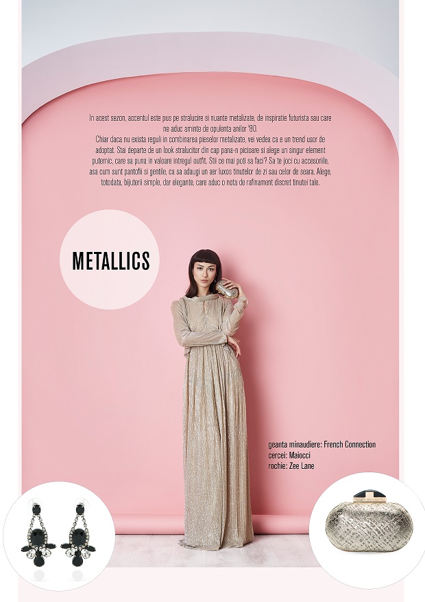În acest sezon, accentul este pus pe nuanțe metalizate, inspirate atât din viitor, cât și din opulența anilor '80. Chiar dacă nu există reguli în combinarea pieselor metalizate, vei vedea că e un trend ușor de adoptat. Stai departe de un look strălucitor din cap până-n picioare și alege un singur element puternic, care să pună în valoare întregul outfit. Știi ce mai poți să faci? Să te joci cu accesoriile, așa cum sunt pantofii și gențile, ca să adaugi un aer luxos ținutelor de zi sau celor de seară. Alege, totodată, bijuterii simple, dar elegante, care aduc o notă de rafinament discret ținutei tale. Poți găsi o serie de obiecte vestimentare care să te inspire, în categoria dedicată de pe Fashion Days.