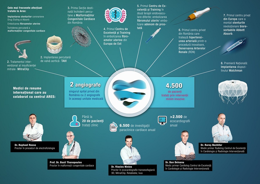 “In cadrul Centrelor ARES, pacientii nostri pot beneficia de intervenii minim invazive, ca o alternativa la tratamentele clasice, de multe ori, traumatizante. De la infiintarea Centrelor in 2010 si pana in prezent, avem peste 3.200 de pacienti care au ales sa se trateze cu succes in centrul din Bucuresti, iar, anul trecut, am efectuat peste 1.100 de proceduri in cadrul Centrelor ARES Bucuresti. Odata cu relocarea, avem la dispozitie doua sali de angiografie, astfel incat putem dubla capacitatea de lucru, reducand timpii de asteptare de la internare si pana la finalizarea procedurii. De asemenea, avem un sistem de back-up permanent in cazul in care un sistem se defecteaza. Siguranta pacientului este pe primul loc, iar garantia functionarii in permenenta a unui aparat de angiografie reprezinta, pentru noi, o prioritate“